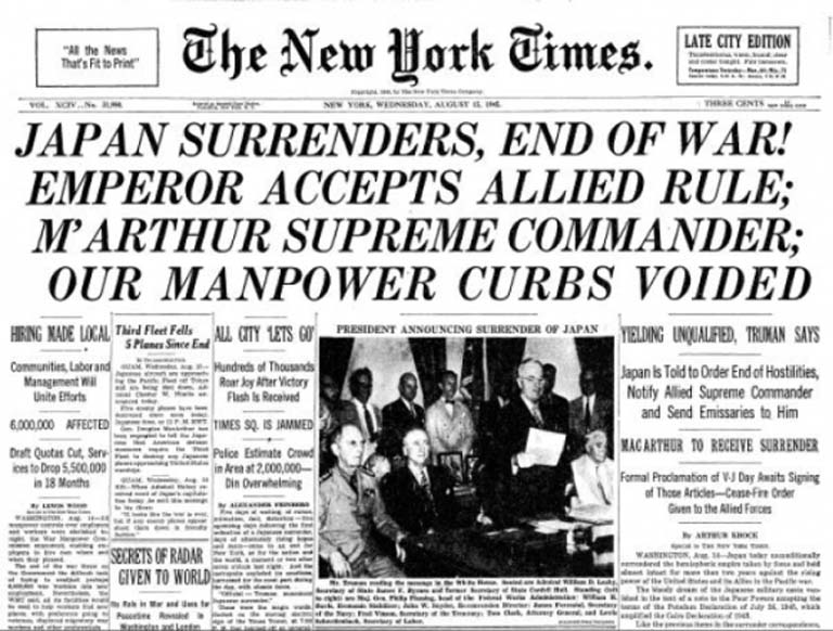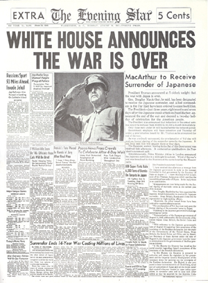 Victory over Japan Day (also known as Victory in the Pacific Day, V-J Day, or V-P Day) is a name chosen for the day on which Japan surrendered, effectively ending World War II, and subsequent anniversaries of that event. The term has been applied to both of the days on which the initial announcement of Japan's surrender was made – to the afternoon of August 15, 1945, in Japan, and, because of time zone differences, to August 14, 1945 (when it was announced in the United States and the rest of the Americas and Eastern Pacific Islands) – as well as to September 2, 1945, when the signing of the surrender document occurred, officially ending World War II. From Wikipedia