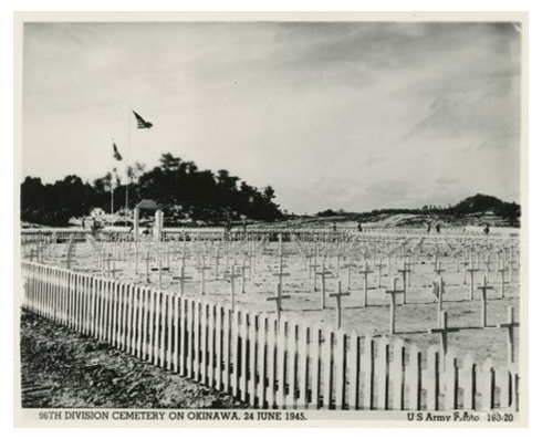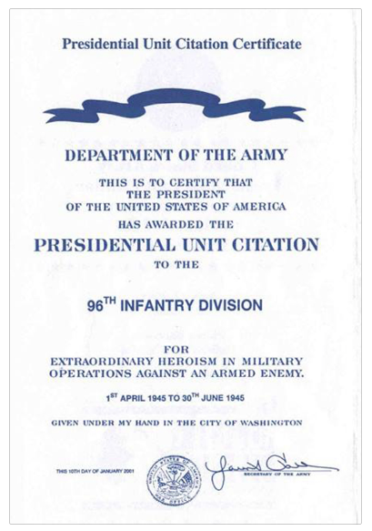 The 96th Division received both the Presidential Unit Citation and the Philippine Presidential Unit Citation, for combat operations on Okinawa and Leyte, respectively. |