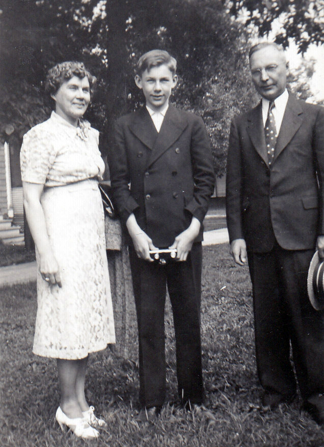 In Don's backyard about 1942. The family car is in front of their garage. The single opening in the wall was where his homing pigeonns entered their cage within the garage.