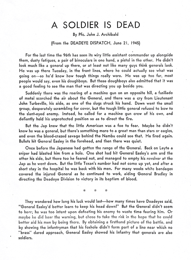 Soon after the United States’ entry into World War II, General Easley took command of the 325th Infantry Regiment of the 82nd Infantry Division. He left that unit to become the Assistant Division Commander of the 96th Infantry Division at the time of its activation in August, 1942, at Camp Adair, Oregon.