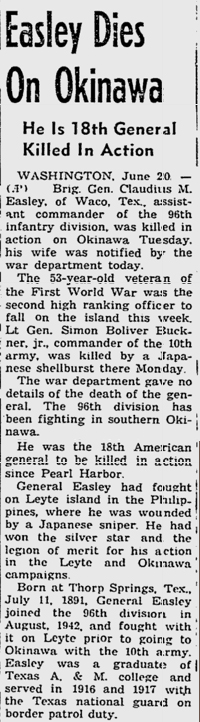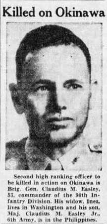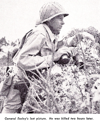 General Easley, known by all as a front-line soldier, was pointing out the location of a machine gun when two bullets from the gun struck him in the forehead.